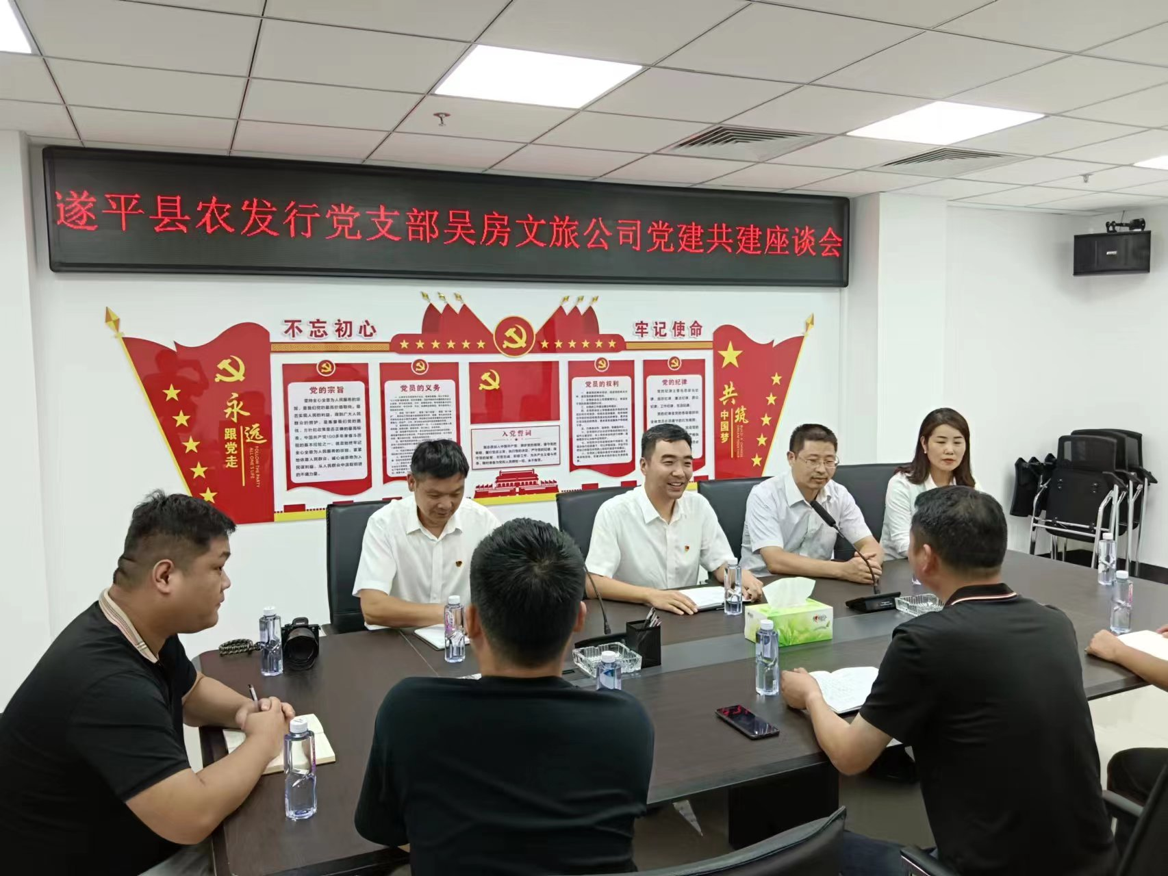 该项目负责人郭永生同志在党建共建座谈会上说:首先感谢遂平农发行对吴房文化旅游公司的金融支持,在公司党支部的领导下,我们将以党建共建为纽带,相互学习、互通信息、互利双赢,促进双方党建工作和业务深度合作再上一个新台阶。