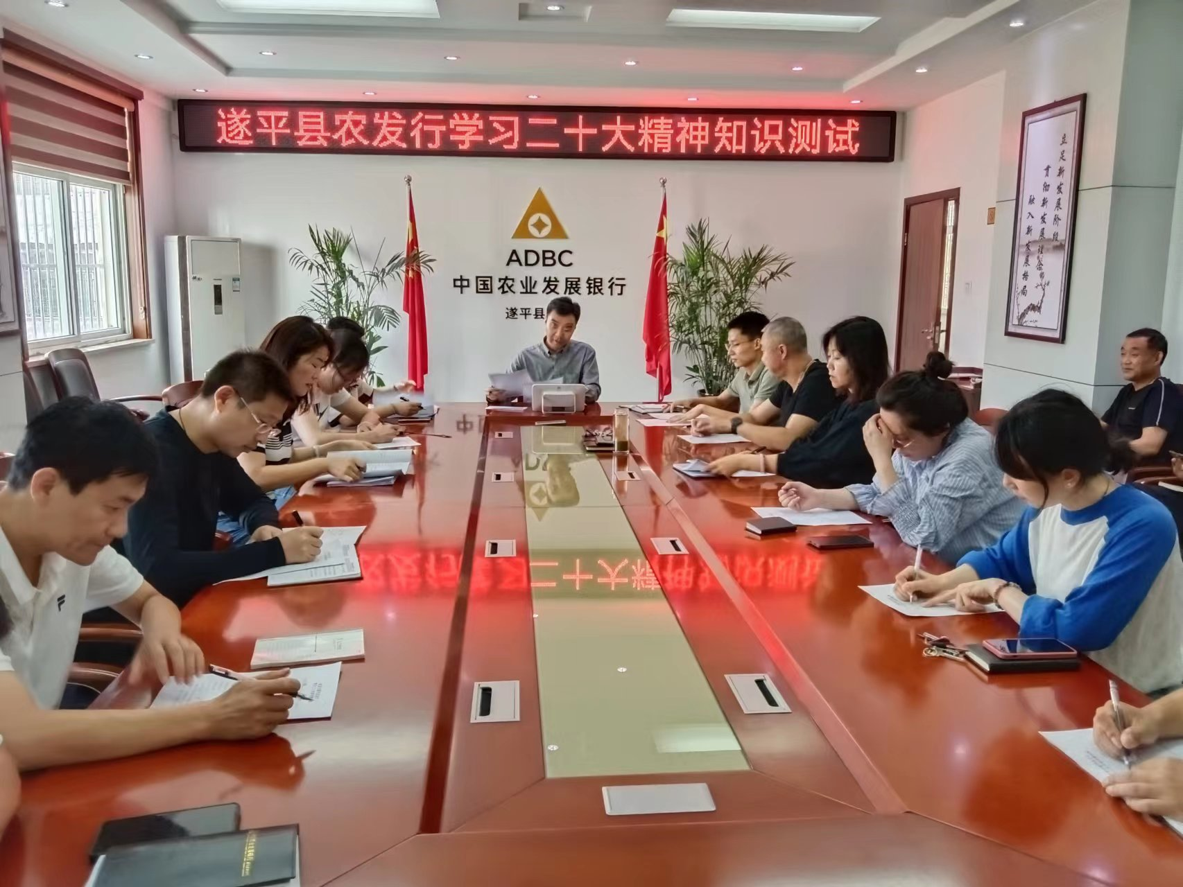 农金在线河南讯 为进一步提高全体员工学习二十大精神的热情,推进学习好、领会好、贯彻好党的二十大精神,帮助员工进一步吃透精神实质,把握核心要义,营造“以考促学、以学促用”的浓厚学习氛围,农发行遂平县支行于8月28日,组织全体员工开展了学习二十大精神知识考试。