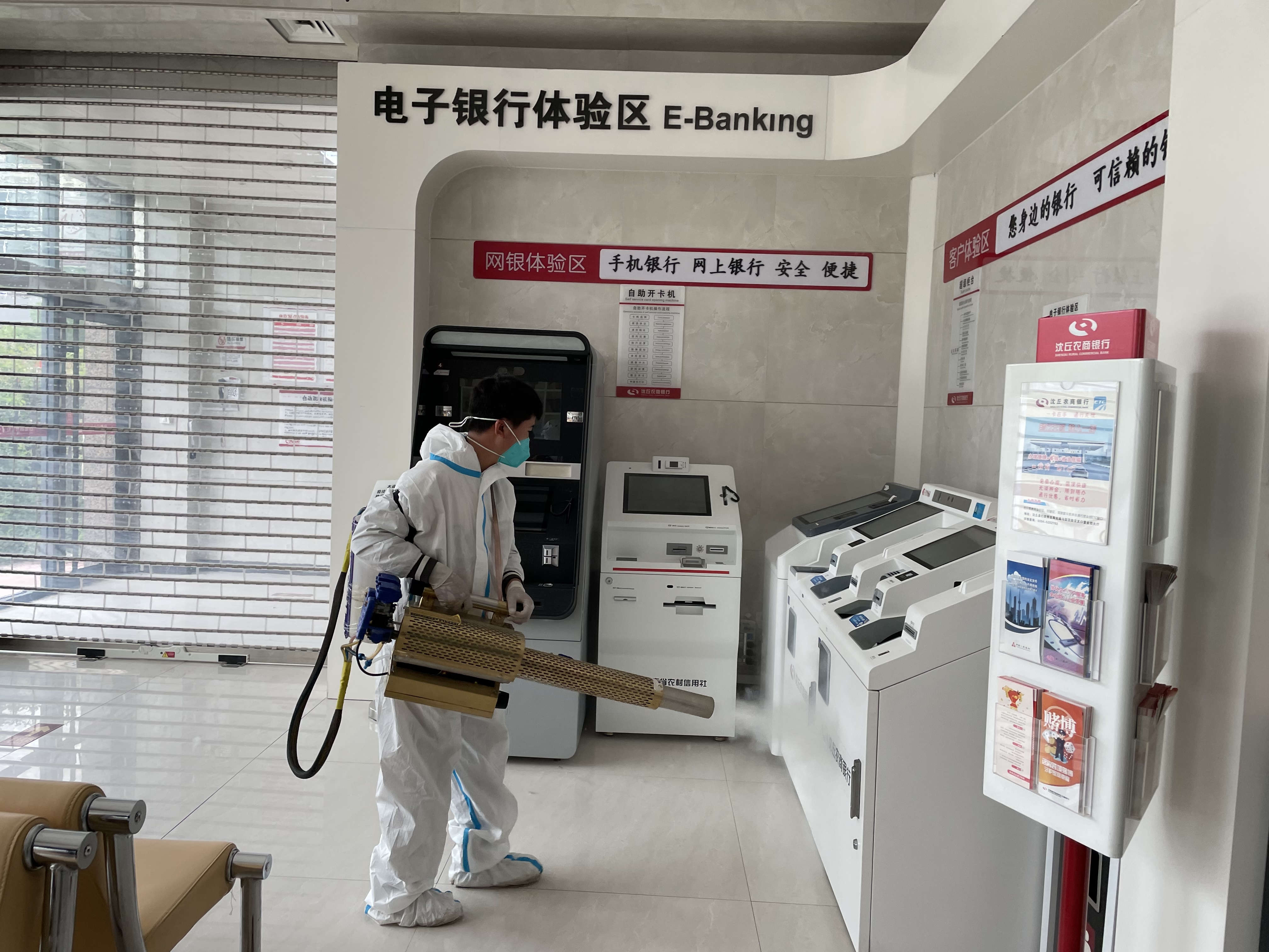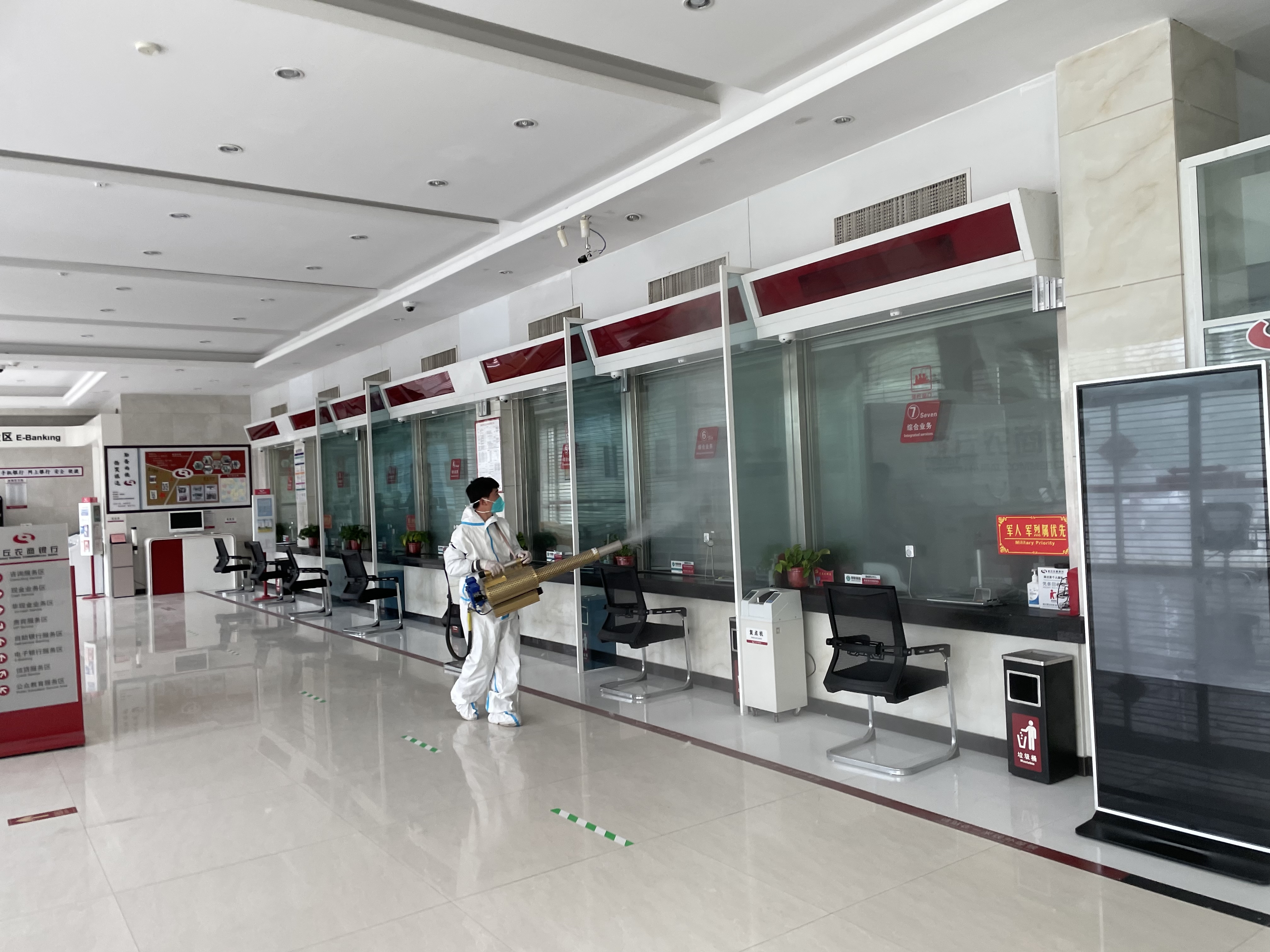 消杀工作人员重点对该行办公楼网点大厅、柜面窗口、等候落座区、自助设备、VIP室等公共场所开展消杀工作,确保消毒消杀全覆盖、无缝隙,为员工及客户提供干净、卫生的办公及营业环境。
