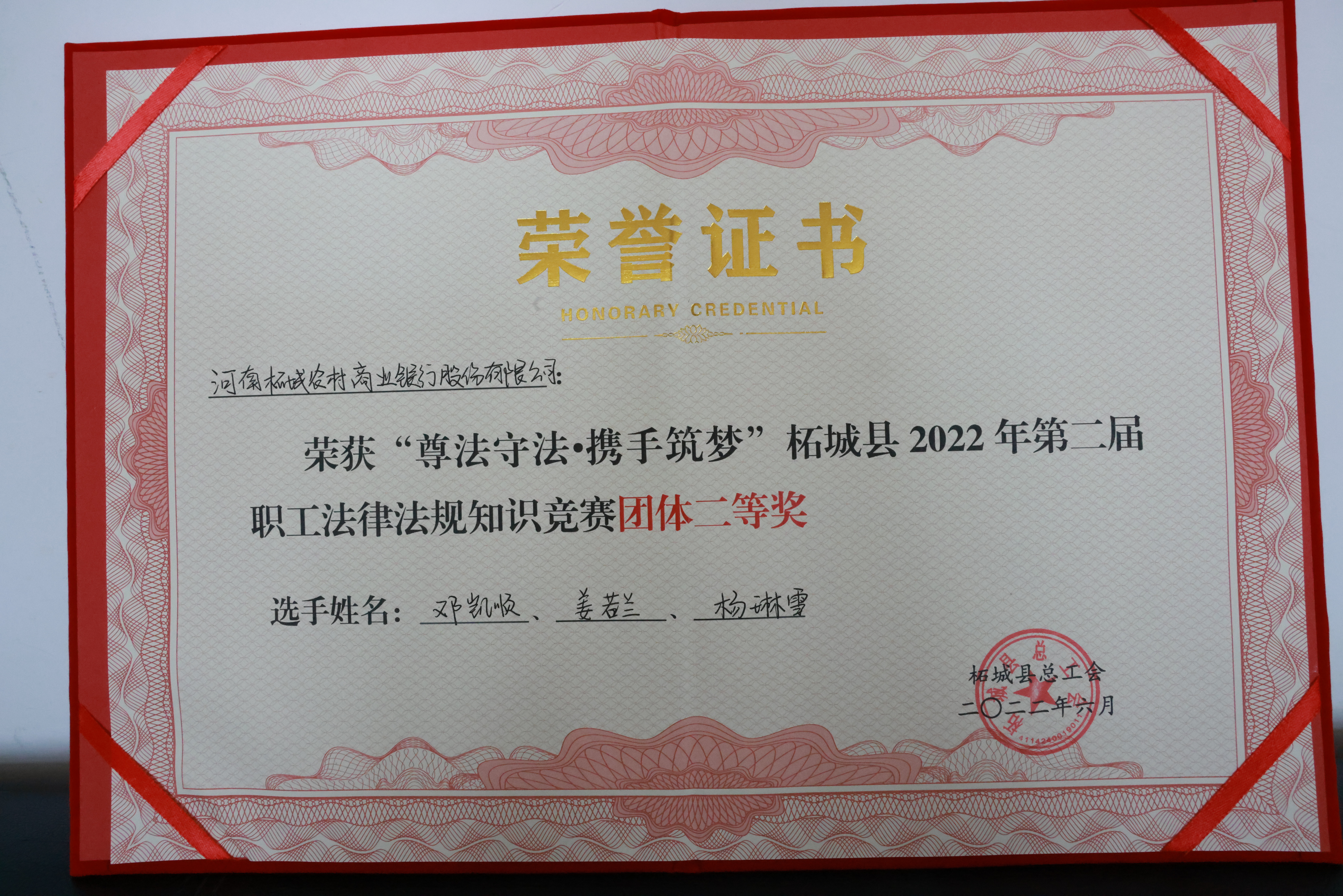 此次比赛是由柘城县总工会主办、县司法局、县融媒体中心等单位协办,全县各家单位积极参与的盛大比赛项目,经过层层选拔,进入决赛的共有6支代表队。柘城农商银行代表队沉稳应答、群策群力,在层层角逐中杀出重围,以优异成绩斩获二等奖! 近年来,柘城农商银行高度重视对干部职工的普法教育、注重培养干部职工法律合规意识。