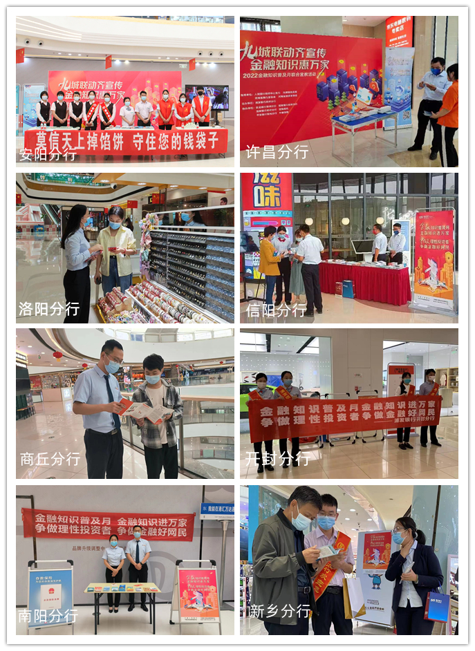 自今年9月份,河南银保监局、人行郑州中心支行在全省启动了2022年金融知识普及月宣传教育活动以来,在河南银保监局、人民银行郑州中心支行、河南省银行业协会、河南省金融消费权益保护协会的大力支持和悉心指导下,浦发银行郑州分行、农业银行河南省分行、招商银行郑州银行、浙商银行郑州分行、平安银行郑州分行、百瑞信托、中邮保险河南分公司7家机构认真践行社会责任和宣传教育主体责任,积极响应、迅速行动,紧密围绕宣传主题,结合区域特色,多角度、多渠道、多形式开展宣传活动。线下结合疫情防控要求,积极开展送金融知识进企业、进社区、进乡村、进校园、进商圈宣传活动,打通金融知识普及的最后一公里。线上充分利用数字化手段和媒体平台,扩大宣传教育的辐射面、受众面,全力以赴推进金融消费者教育和金融知识普及走深走实,真正做到让消费者“懂金融、信金融、用金融、受益于金融”,使金融的发展更好地满足人民日益增长的美好生活需要。