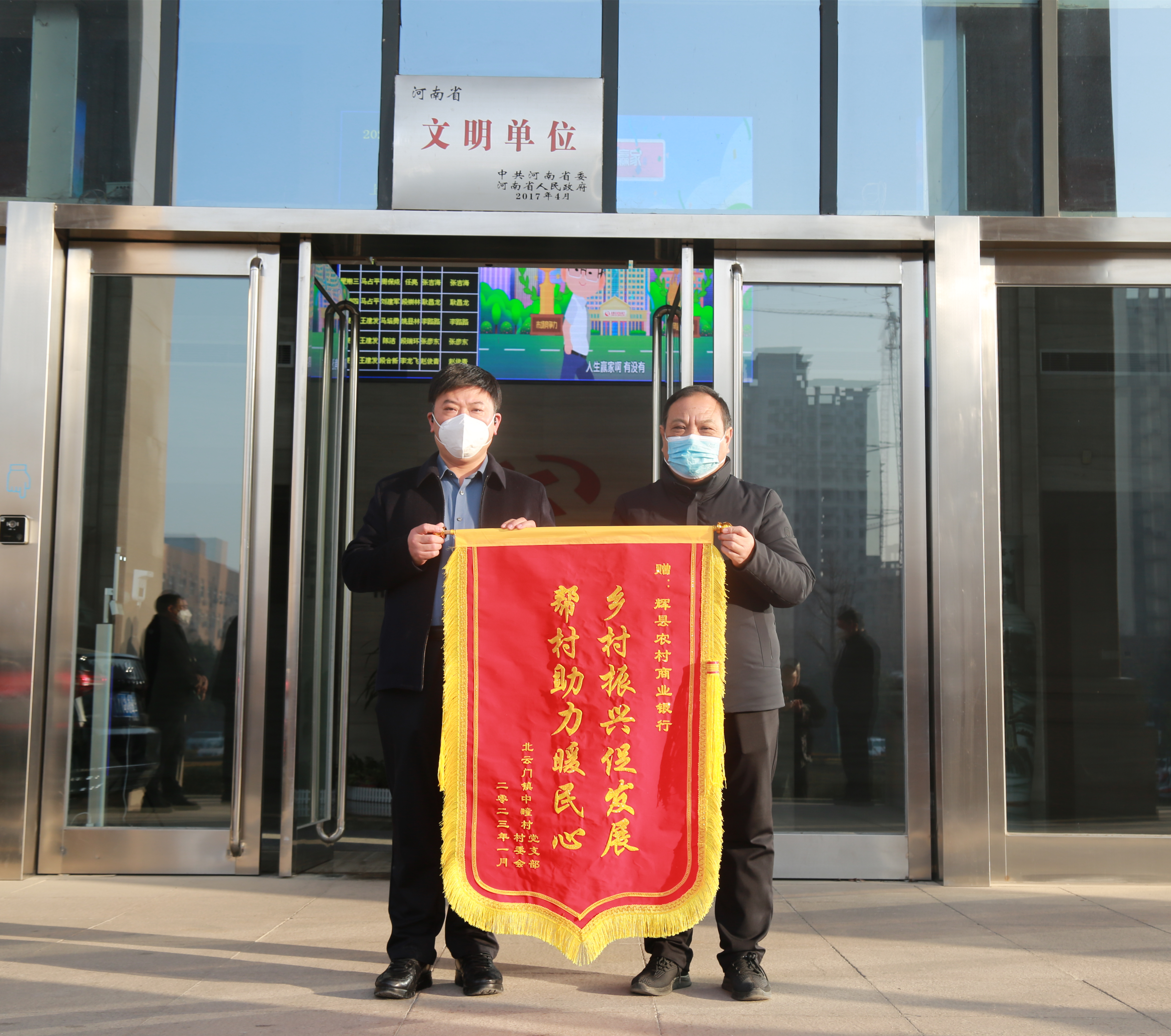 农金在线河南讯 2023年1月6日,北云门镇中疃村党支部书记李如生一行来到辉县农商银行,将一面饱含全体村民感激之情的锦旗送到辉县农商银行党委书记、董事长张永政手中,感谢辉县农商银行长期以来的支持和帮扶。