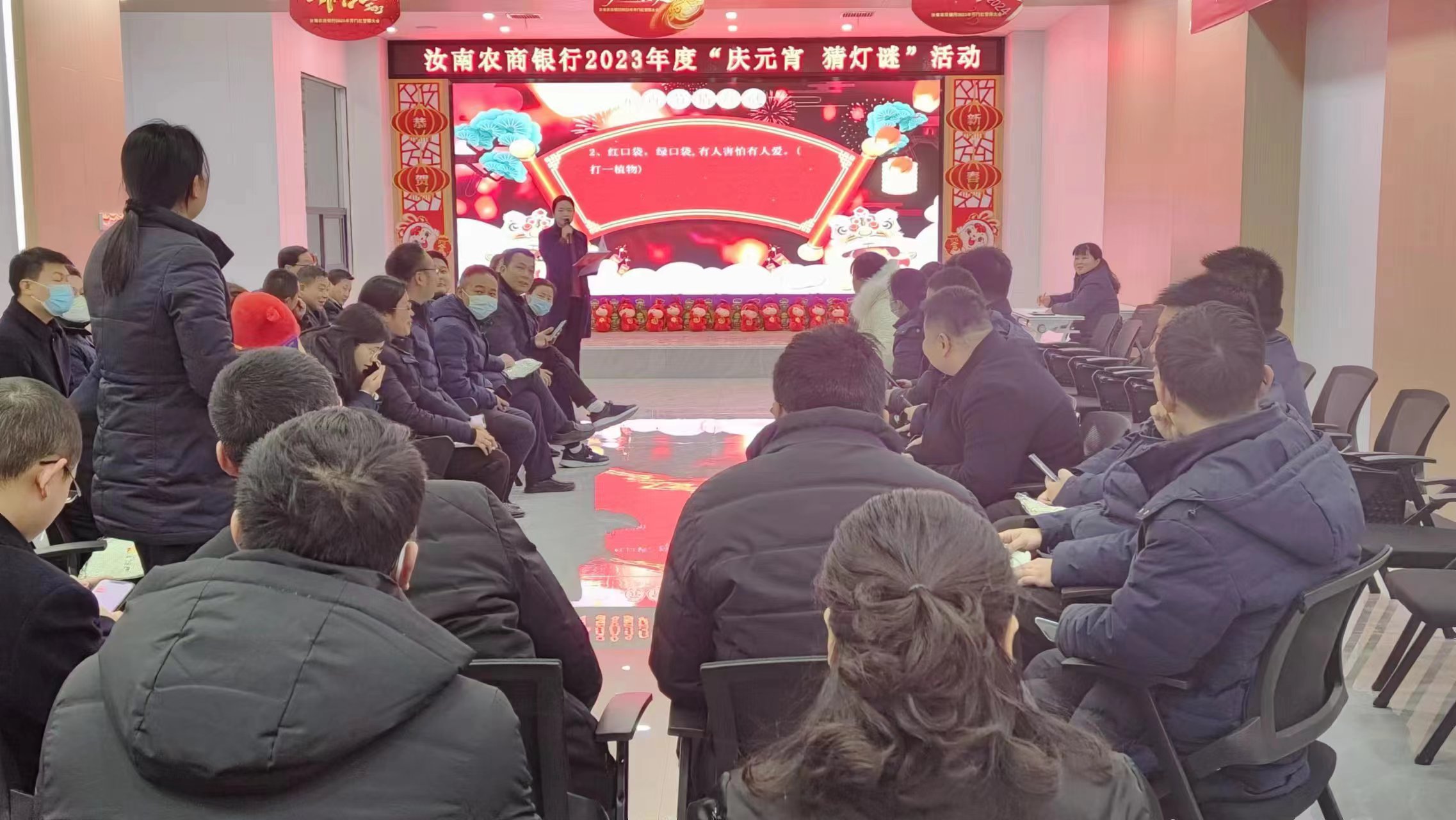 农金在线河南讯 2月3日,汝南农商银行举行"我们的节日"有奖猜灯谜活动。由员工们现场积极参与,开动脑筋竞猜,巧识若隐若现的谜面,竞猜五花八门的谜底。在一片欢声笑语中,营造出干部员工共度元宵节的喜庆氛围。(杨建国)