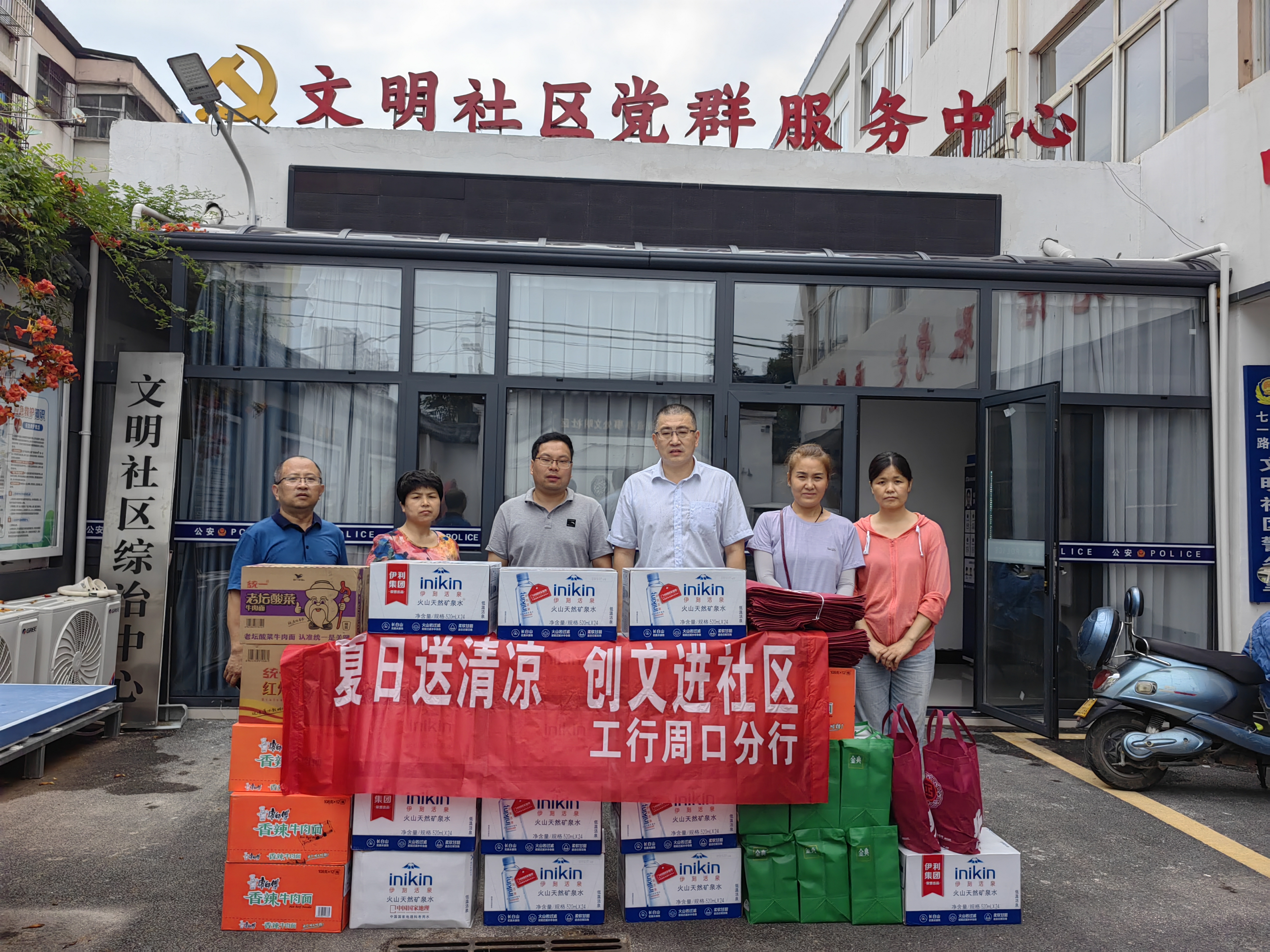 大暑之际,炎热高温。7月26日,工行周口分行走进七一办事处文明社区,为分赴创文“入户大走访”的一线社区人员送去矿泉水、牛奶和方便面等消暑慰问品,以实际行动感谢关爱社区工作人员,叮嘱大家增强安全健康防护意识,落实好高温户外防暑降温,紧紧围绕我市创文工作重点,做实落细社区和工行周口分行联手共创全国文明城市“入户大走访”活动。