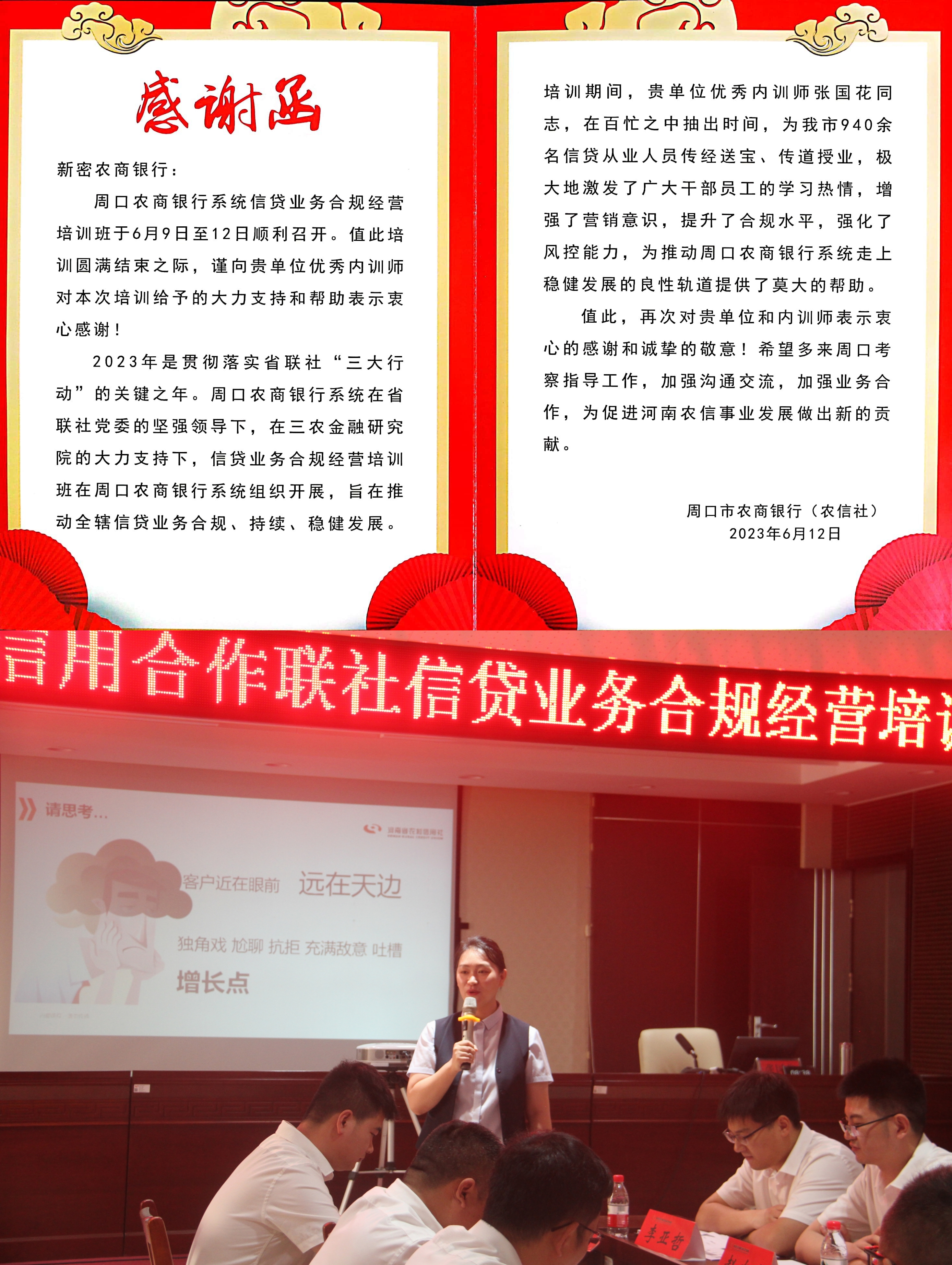 农金在线河南讯 近日,周口市农商银行向新密农商银行发来感谢函,对新密农商银行内训师张国花在周口农商银行系统开展培训工作表示感谢,同时对其在工作中展现出的过硬本领和饱满状态给予充分肯定。
