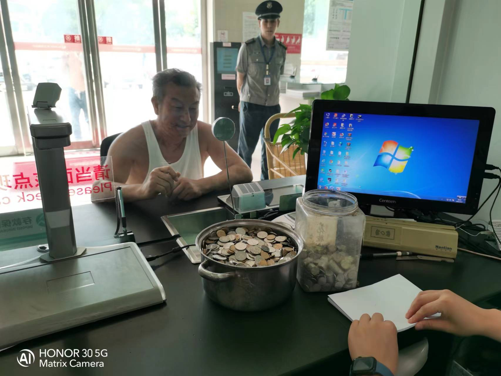 于是,就有了牛大叔端着锅,提着桶走进营业大厅的一幕。柜员接过沉甸甸的饭锅和桶,耐心地进行分拣、查数、打卷……经过不懈努力,终于完成了几十斤重的硬币清点兑换工作。当柜员把1967元存入牛大叔的银行卡时,他高兴地连声道谢,现场拿起纸笔,写了一封感谢信。