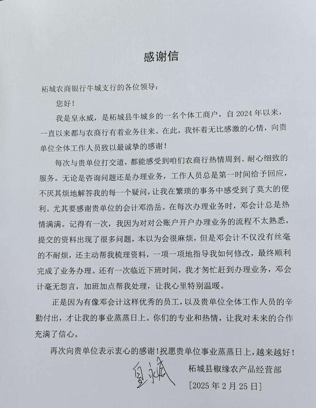农金在线河南讯 近日,柘城农商银行牛城支行收到了来自客户皇先生的一封满怀深情的感谢信,对柘城农商银行热情主动、暖心周到的服务,给予了充分的肯定和赞扬。 据悉,这位客户每次前来办理对公业务,牛城支行的工作人员都会展现出极高的专业素养和服务热情,在处理该客户业务时,做到了细致入微、周到全面。特别是客户在开立对公户期间,牛城支行的运营主管邓浩岳充分考虑到客户时间的宝贵,合理安排各项流程,提高办理效率,减少客户等待时间,让他深刻感受到了牛城支行工作时的用心,原本繁琐的业务办理变得轻松愉快。