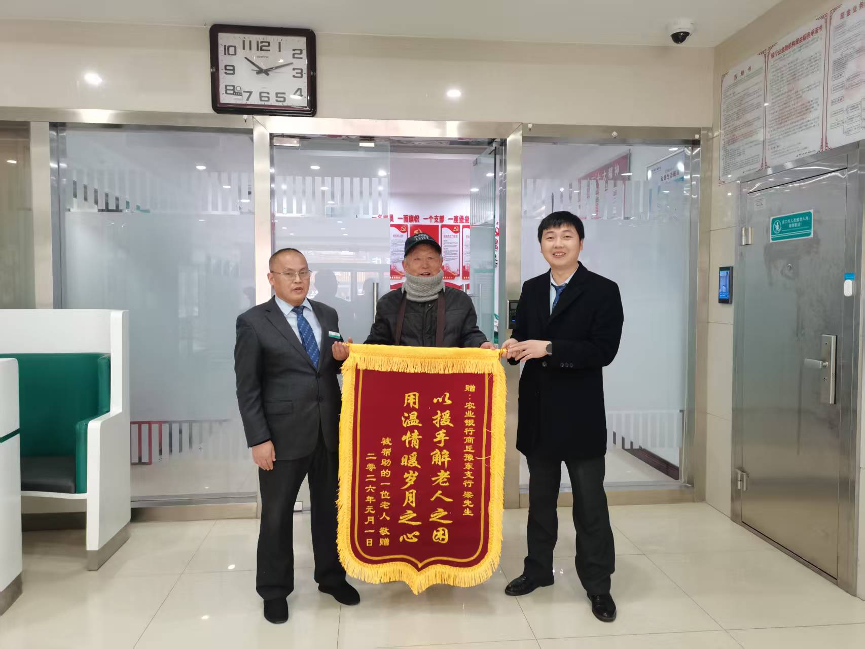 农金在线河南讯 1月12日,中国农业银行商丘豫东支行营业大厅内暖意融融,一面印有“以援手解老人之困,用温情暖岁月之心”的鲜红锦旗格外醒目。送旗人是一位老先生,他专程赶来,只为向该行客户经理梁合东当面致谢。这面锦旗背后,是一个关于守护与信任的暖心故事。