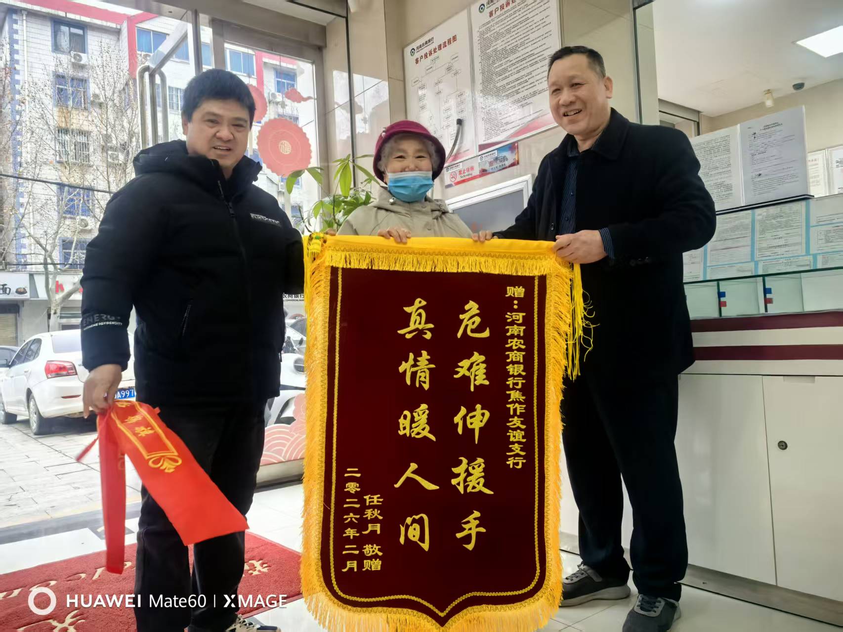 农金在线河南讯 2月26日上午,一位老人在家人的陪伴下,专程来到河南农商银行焦作友谊支行,将一面印有“危难伸援手 真情暖人间”的锦旗郑重送到员工李全付手中,用最朴实的方式,对他此前及时救助自己就医的善举表达衷心感谢。