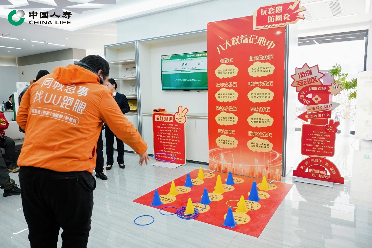 智能互动“零距离” 寓教于乐筑牢防线 在智能体验区与智能教学区,全省柜面统一配置了iPad演示终端、智能柜员机、大屏电视及空中客服设备。工作人员手把手指导客户使用中国人寿寿险APP,从投保、保全到理赔全流程演示,帮助老年客户跨越“数字鸿沟”。手机安全小课堂现场教学设置账户安全锁、识别钓鱼短信,AI客服语音指令体验让客户感受“秒级响应”的智能服务。一旁的消保互动区则热闹非凡,“消保套圈”游戏吸引众多客户驻足——地面铺设的题目涵盖“代理退保风险”“高收益理财陷阱”等知识点。欢声笑语中,金融知识悄然入心,风险防范意识在趣味互动中生根发芽。