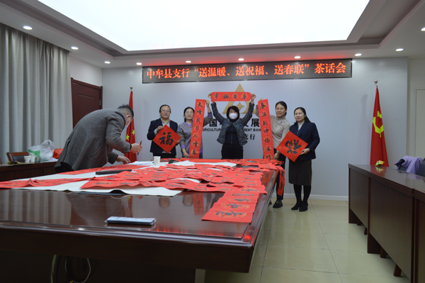 农金在线河南讯 春节将至,为进一步弘扬中华传统节日,着力营造喜庆热烈、欢乐祥和的节日氛围,1月19日下午,农发行中牟县支行举办“送温暖、送祝福、送春联”活动。