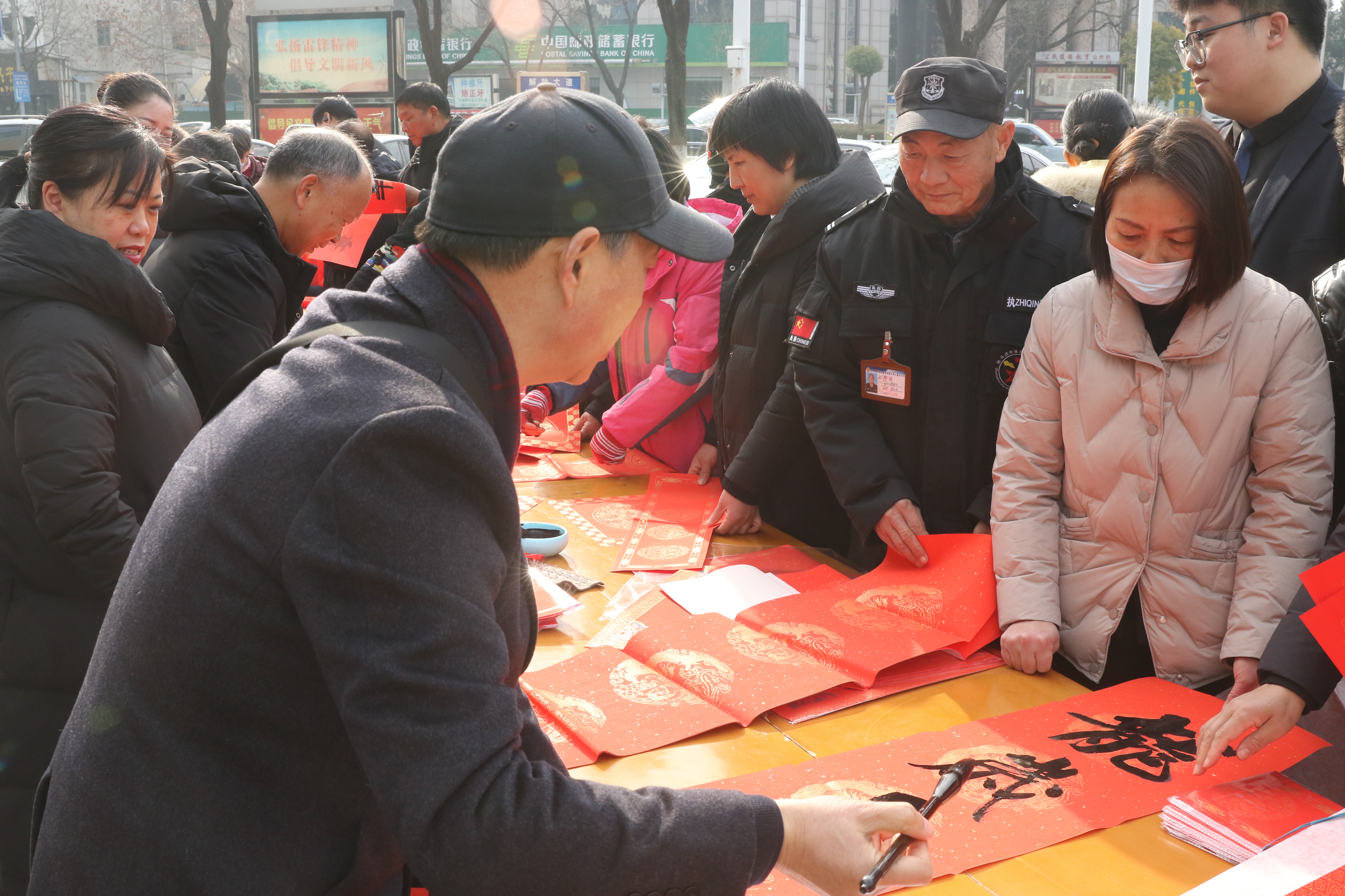 活动现场,书法家们挥毫泼墨,现场为群众书写春联,传递新春祝福。一副副饱含诗情画意的春联,一张张遒劲有力的“福”字,伴着浓浓墨香跃然纸上,增添了喜庆祥和的节日氛围,深受市民的喜爱。前来索取春联的市民和客户络绎不绝,个个脸上洋溢着幸福的笑容。义写春联结束后,书法家们又在我行进行作品创作,为该行干部员工送上龙年祝福和文化盛筵。