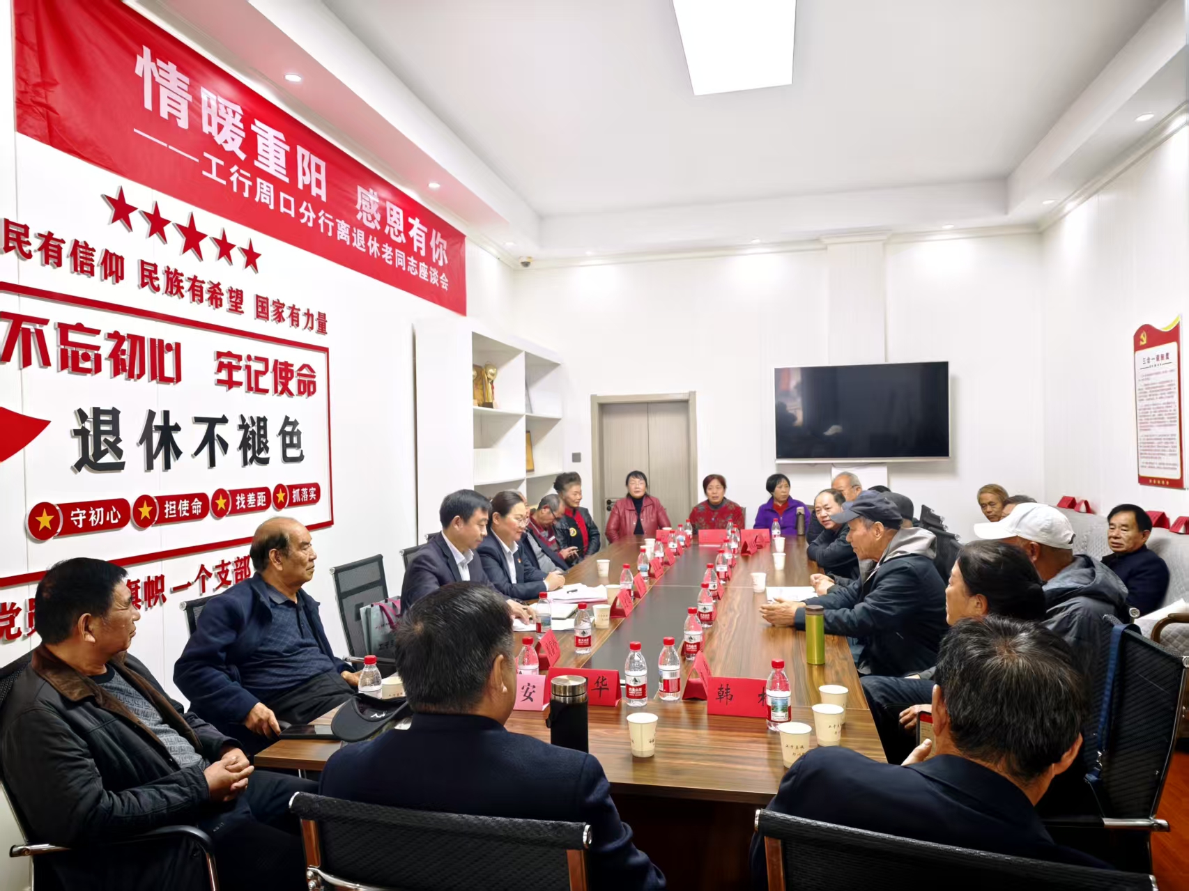 10月29日上午,工行周口分行组织召开离退休老同志座谈会,近30位退休老同志共度重阳佳节。 座谈会中,该行相关负责人代表市行党委向全体离退休老同志致以节日诚挚问候和美好祝福。与大家共同回顾了老一辈工行人勤奋实干、无私奉献的光辉岁月,高度评价他们是周口分行改革发展的奠基者、亲历者与见证者。